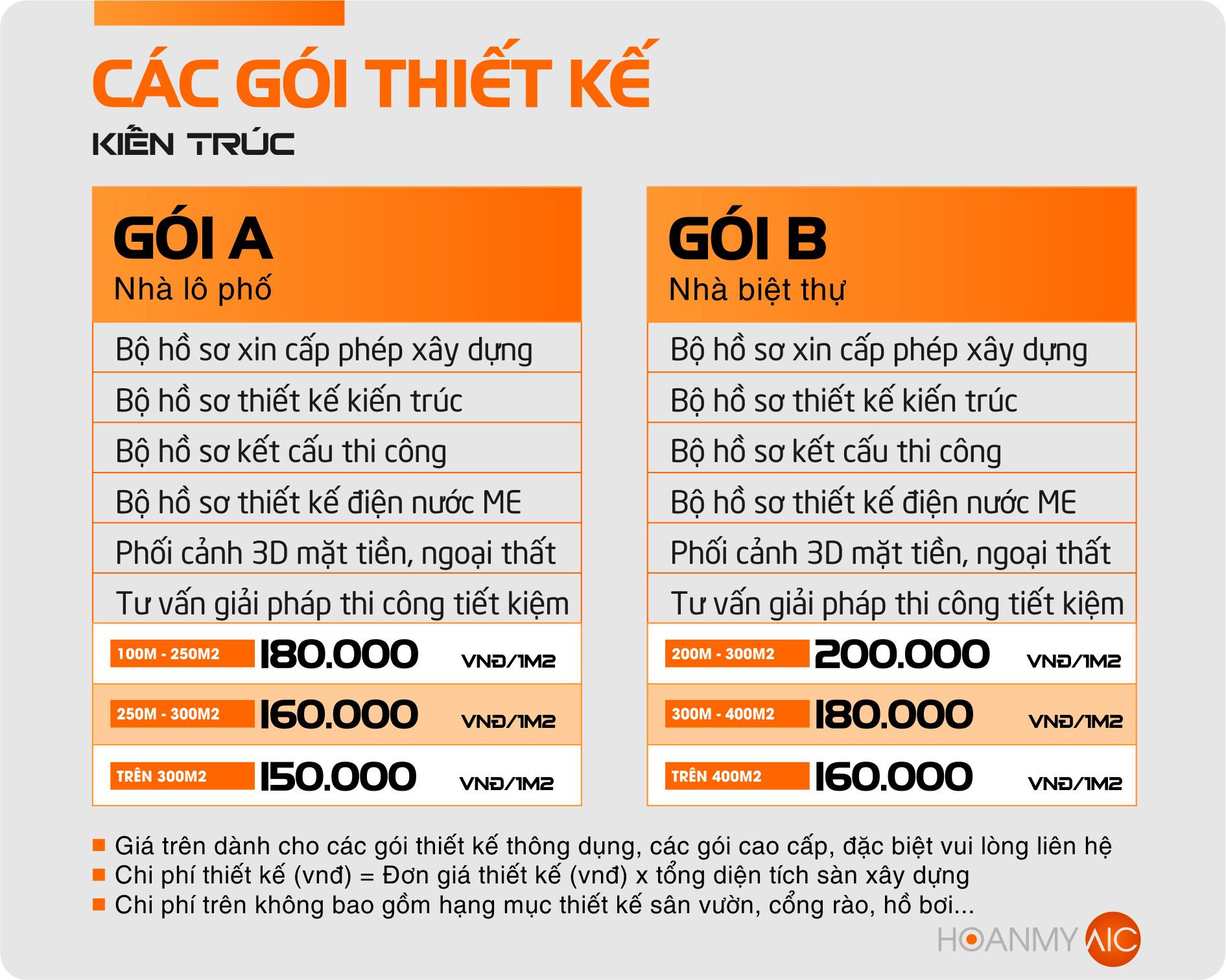 HoanmyAic chuyên tư vấn, thiết kế, thi công xây dựng mới nhà ở, thiết kế biệt thự, nhà phố, nhà ống, công trình dân dụng và công nghiệp. Sửa chữa các hạng mục công trình nhà ở theo yêu cầu. kế nội, ngoại thất công trình, cung cấp vật liệu. Chúng tôi xin gửi tới quý khách hàng bảng giá thiết kế mới nhất: